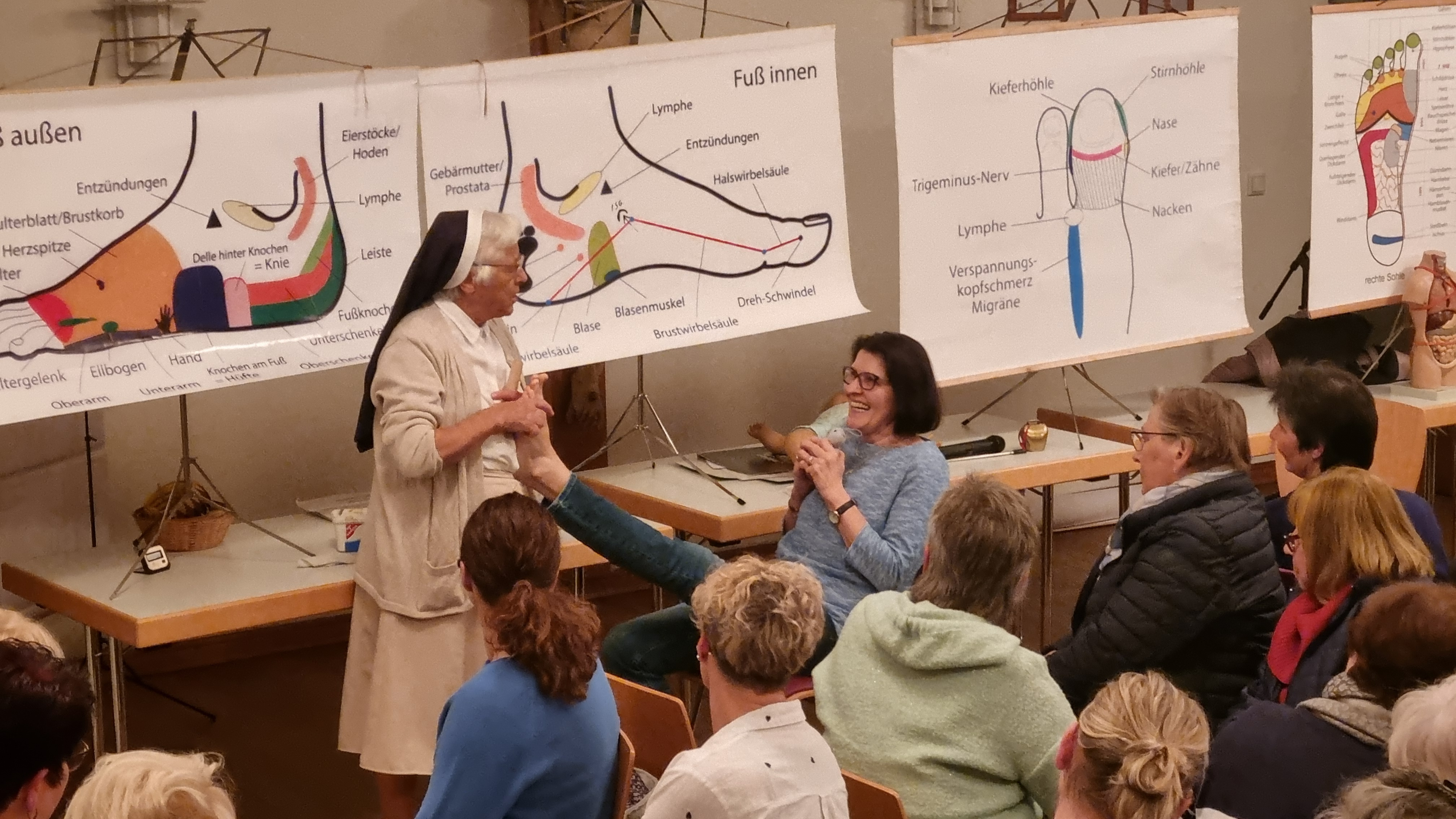 Als dann Sr. Jubilata an einigen Teilnehmern und Teilnehmerinnen Hand anlegte, fragte sie: Wo tut's weh? Das war ihre Frage, um den richtigen Nerv zu treffen. Und sie traf ihn jedes Mal punktgenau. Laute Aua-Schreie gingen durch den Pfarrsaal. Die Ordensfrau forderte die Anwesenden zum aktiven Mittun auf. Die Reflexpunkte konnten gleich am Gegenüber ausprobiert werden. Dabei könne man nichts falsch machen. Schwester Jubilata verstand es auf ihre begeisterungsfähige Art, die Zuhörer zu fesseln.