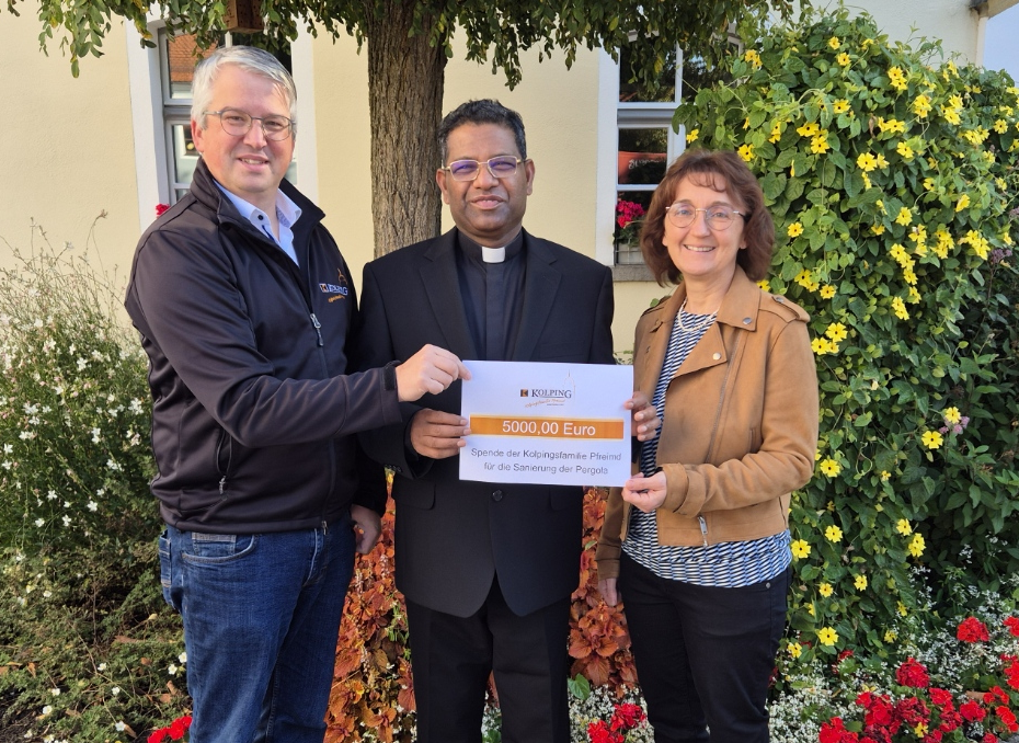 Am Kirwasonntag konnten die beiden Kolping-Vorsitzenden Georg Hirmer und Maria Richthammer mit 5000 Euro die zweitgrößte Einzelspende in der Vereinsgeschichte an Stadtpfarrer P. Georg übergeben. Die stolze Summe wird für die Sanierung der Pergola, einem beliebten Treffpunkt im Jugendheimgarten, eingesetzt werden. Sie wurde Anfang der 80er Jahre gebaut und so war eine grundlegenden Renovierung dringend von Nöten.